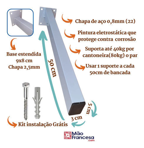 O suporte de pia de parafusar, também conhecido como mão francesa, cantoneira ou grapa é ideal para instalar pia de mármore na cozinha, pia de granito no banheiro, tanque e bancada. O suporte reforçado também pode ser utilizado em prateleiras largas.