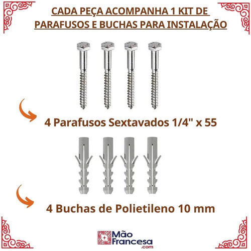 - Conteúdo: 2 suportes + 8 parafusos sextavados ¼”x55mm e 8 buchas de nylon nº 10